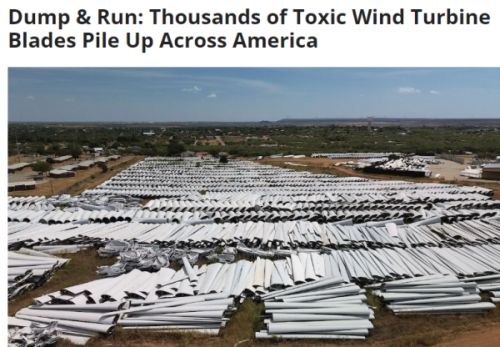 "Across the USA, wind power outfits are being repeatedly busted for dumping their blades and simply cutting and running. Then there are scammers like Global Fiberglass Solutions Inc which makes claims about recycling dumped blades, notwithstanding there is no market for ground up toxic waste, funnily enough. Principal among the toxic agents to be found in turbine blades is Bisphenol A - a compound banned in numerous countries. Back in August 2021, Global Fiberglass Solutions Inc was busted for piling up over 1,300 blades at three makeshift dumps in Iowa - despite claiming it would 'recycle' them."