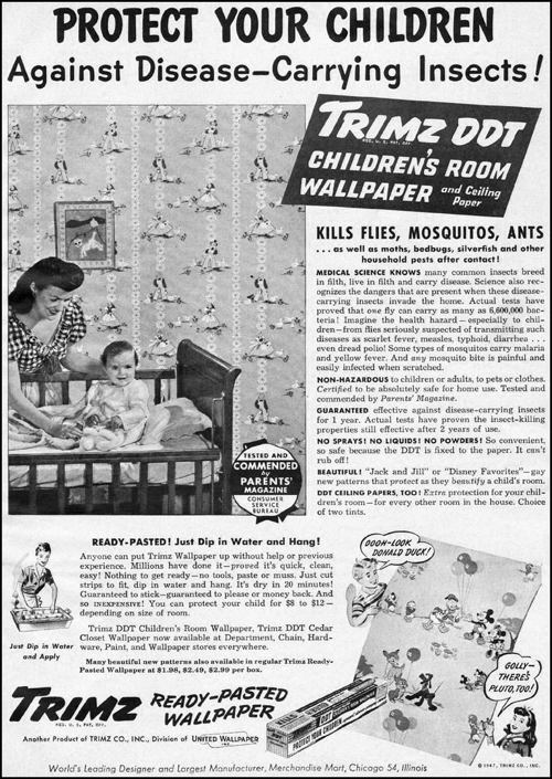 "... midcentury farmers coated their fields and orchards and even livestock in astonishing quantities of DDT. The pesticide was injected into walls and wallpaper, mattresses and clothing. Housewives used DDT to wipe out annoying pests, dousing their own pets with the stuff to kill fleas. A few rumblings of concern arose: cows across the country dying en masse due to a mysterious 'X disease'; humans (including Bing Crosby and Errol Flynn) being diagnosed with 'virus X' after suffering joint pain, muscle weakness, fatigue, and severe headaches."