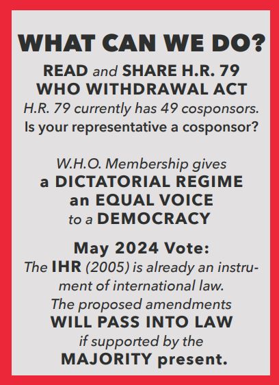 The WHO is blatantly seeking to increase its power by pursuing a legally-binding "Pandemic Treaty" and proposed amendments to the International Health Regulations. The WHO seeks to turn its recommendations into legally-binding orders and control. The WHO seeks to have the 194 member nations surrender their sovereignty to the WHO. This must NOT be allowed to happen.